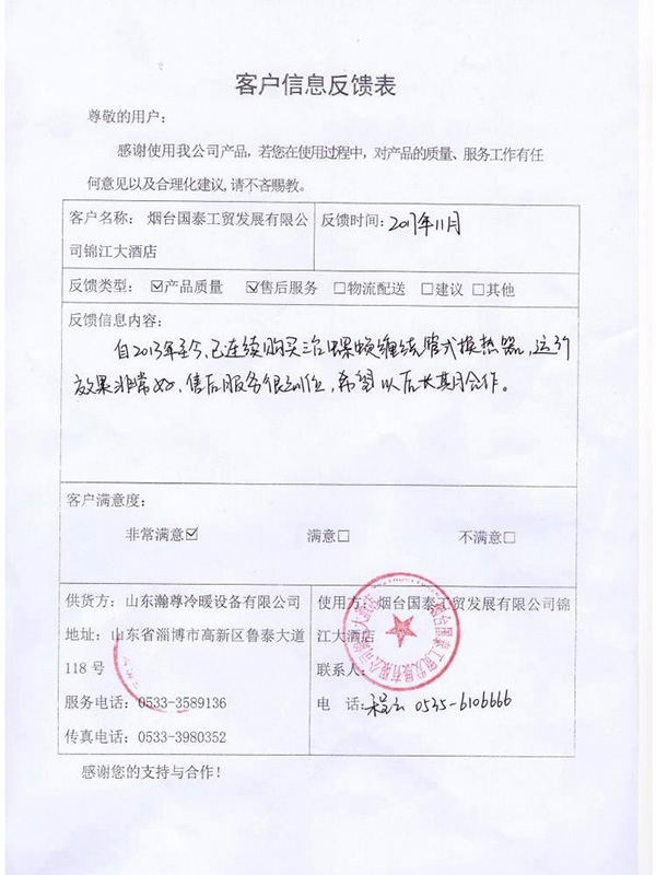 山東瀚尊冷暖設備有限公司坐落在美麗的齊國古都---淄博,是一家以換熱(冷凝)產品研發、生產、營銷為一體的企業;自2008年以來,通過與中外知名熱力設備制造商合作以及自主探索和創新,于2010年成功研制生產出了公司第一臺螺旋纏繞管式換熱器;同時,公司依托自身強大的技術力量和研發能力,于2016年成功研制生產無死角無菌級雙管板式換熱器,近年來,公司努力走在中國換熱器行業的前列,致力于創造民族品牌,為用戶提供專業技術支持與服務......